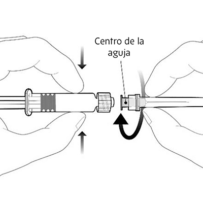 Para fijar la aguja, conecte el centro en el adaptador de bloqueo luer y rote un cuarto de giro en el sentido de las agujas del reloj hasta que vea que se cierra. No jale del émbolo de la jeringa fuera del barril. Si esto ocurre, no aplique la vacuna. |