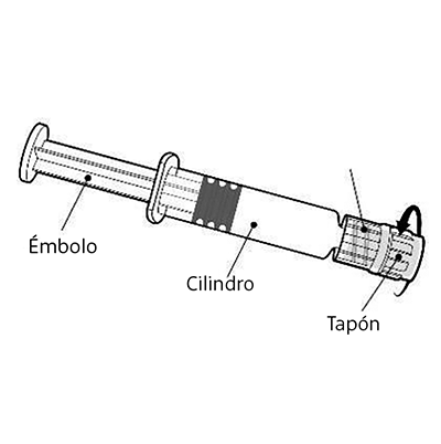 Sostenga la jeringa por el cilindro, no por el émbolo. Desenrosque la tapa de la jeringa girándola en sentido contrario a las agujas del reloj. |