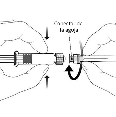 Para colocar la aguja a la jeringa gírela un cuarto de vuelta en el sentido de las agujas del reloj hasta que sienta que se bloquea. Retire el protector de la aguja. No saque el émbolo de la jeringa del cilindro. Si esto sucede, no administre la vacuna. Administre la vacuna. |