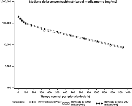 Los parámetros PK de la media aritmética (± desviación estándar o DE) para IXIFI® (infliximab de Pfizer), Remicade de la UE (infliximab de la Unión Europea) y Remicade de EE. UU. (infliximab de Estados Unidos) se resumen en la Tabla 1. De forma consistente con los perfiles de concentración-tiempo, las estimaciones de la Cmáx, ABCT y ABCinf media fueron similares entre los 3 medicamentos del estudio. Además, la variabilidad entre sujetos para cada uno de los parámetros PK fue similar entre los 3 medicamentos del estudio, con valores de % CV del 20% al 24%; del 21% al 25% y del 23% al 28% para la Cmáx, ABCT y ABCinf, respectivamente.