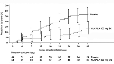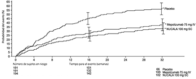 Estudios confirmatorios: Se estudiaron un total de 711 pacientes con asma grave en los 2 estudios confirmatorios (Estudios 2 y 3). En estos 2 estudios, se requirió que los pacientes seleccionados tuvieran eosinófilos en sangre de ≥ 150 células/μL (dentro de las 6 semanas de la dosificación) o eosinófilos en sangre de ≥ 300 células/μL dentro de los 12 meses de reclutamiento. El criterio de detección de eosinófilos en sangre de ≥ 150 células/μL se derivó de análisis exploratorios de datos del Estudio 1. El Estudio 2 fue un estudio controlado con placebo y activo de 32 semanas en sujetos con asma grave con antecedentes de 2 o más exacerbaciones en el año anterior a pesar del uso regular de dosis altas de ICS más controlador(es) adicional(es) con o sin OCS. Los pacientes recibieron mepolizumab 75 mg IV (n = 191), NUCALA® 100 mg (n = 194) o placebo (n = 191) una vez cada 4 semanas durante 32 semanas.