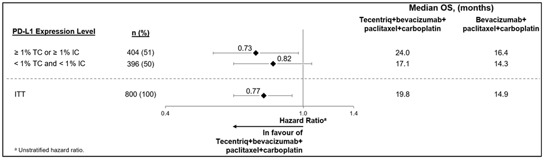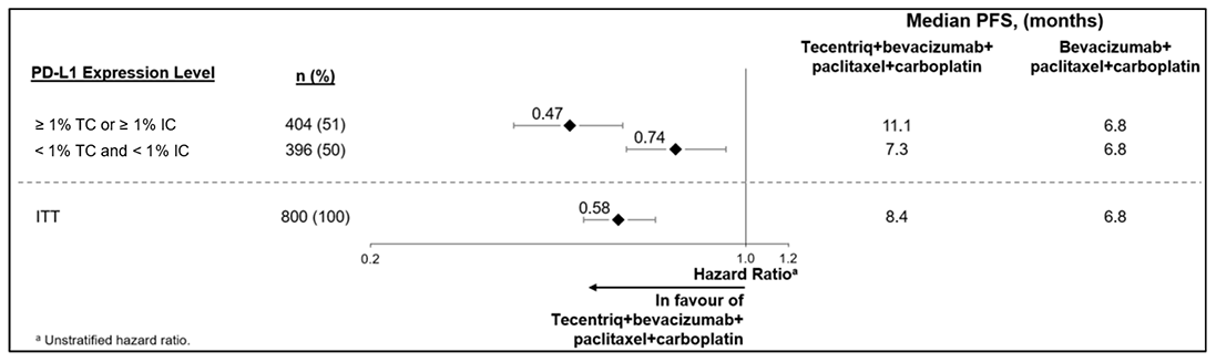 La determinación del estado de PD-L1 es específica de la indicación y su evaluación debe sustentarse en la proporción del área del tumor que ocupan las células inmunitarias que infiltran el tumor (% de IC) con expresión de PD-L1 de cualquier intensidad o el porcentaje de células tumorales (% de TC) con expresión de PD-L1 de cualquier intensidad.