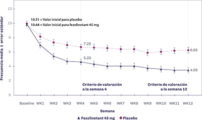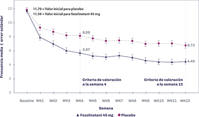 VEOZA® 45 mg redujo la frecuencia y la intensidad de los SVM en una semana. La mejoría en la frecuencia e intensidad de los SVM se mantuvo a lo largo de las 52 semanas de los estudios.
