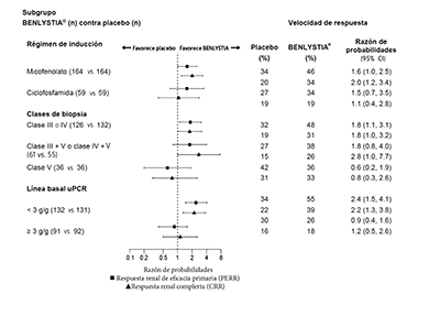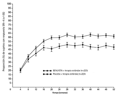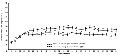La proporción de pacientes que lograron PERR en la semana 104 fue significativamente mayor en los pacientes que recibieron BENLYSTIA® SC más terapia estándar en comparación con placebo más terapia estándar (Tabla 2). Los principales criterios de valoración secundarios también mostraron una mejora significativa con BENLYSTIA® más terapia estándar en comparación con placebo más terapia estándar (Tabla 2 y Tabla 3).
