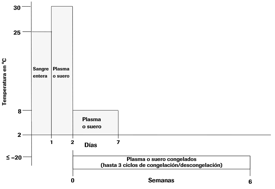 Después de la separación, las muestras de suero o plasma conservado en EDTA pueden almacenarse en tubos secundarios durante un máximo de 24 horas a 30 °C seguido de hasta 5 días de almacenamiento a una temperatura comprendida entre 2 °C y 8 °C o un máximo de 6 semanas a ≤ –20 °C. Para un almacenamiento a más largo plazo se recomiendan temperaturas ≤ –60 °C.