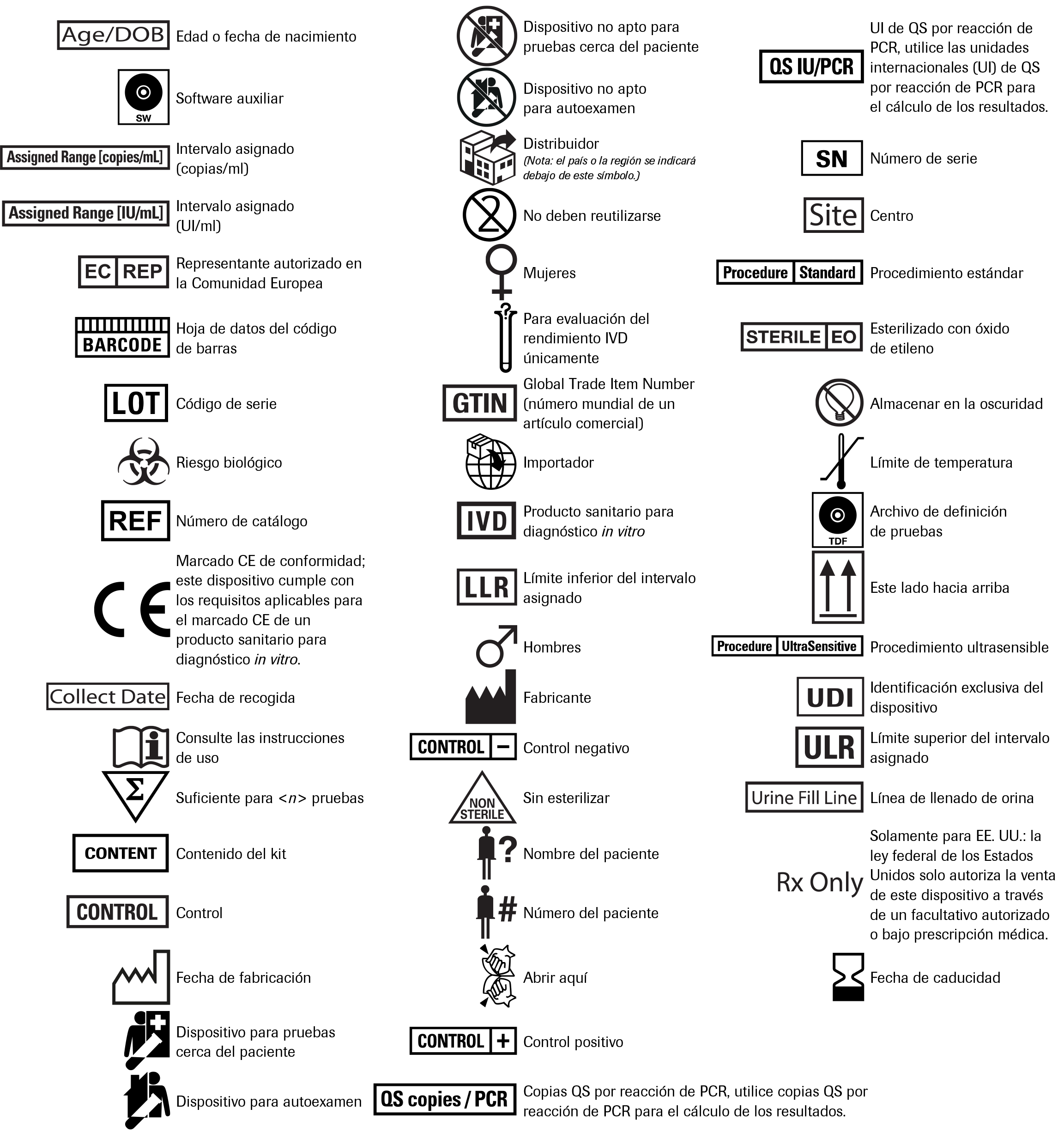 Los símbolos siguientes se emplean en el rotulado de todos los productos de diagnóstico por PCR de Roche.