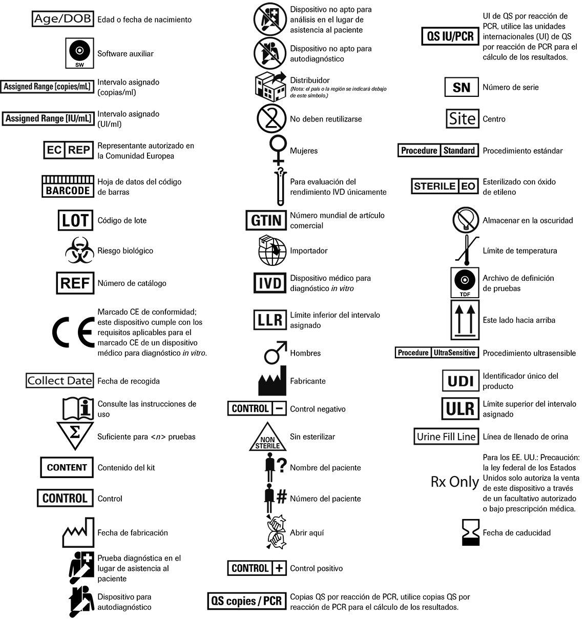 Los símbolos siguientes se emplean en el rotulado de todos los productos de diagnóstico por PCR de Roche.
