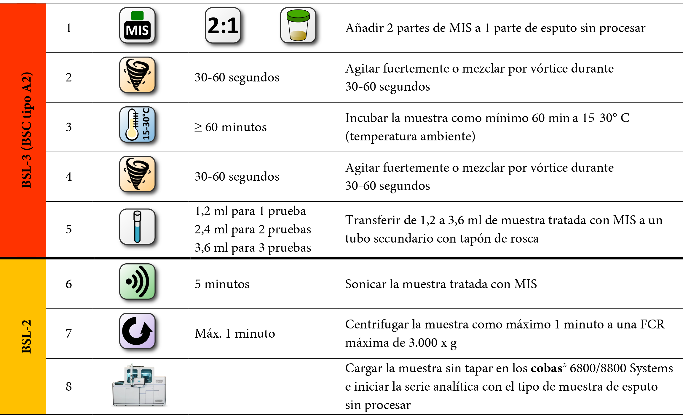La prueba COBAS® MTB se ha validado para su uso con muestras de esputo sin procesar y muestras de sedimento de esputo y de LBA tratadas con NALC-NaOH inactivadas químicamente con el reactivo MIS. No se ha evaluado la aplicación de otros procedimientos de inactivación y su uso puede generar resultados falsos positivos, falsos negativos y/o inválidos.