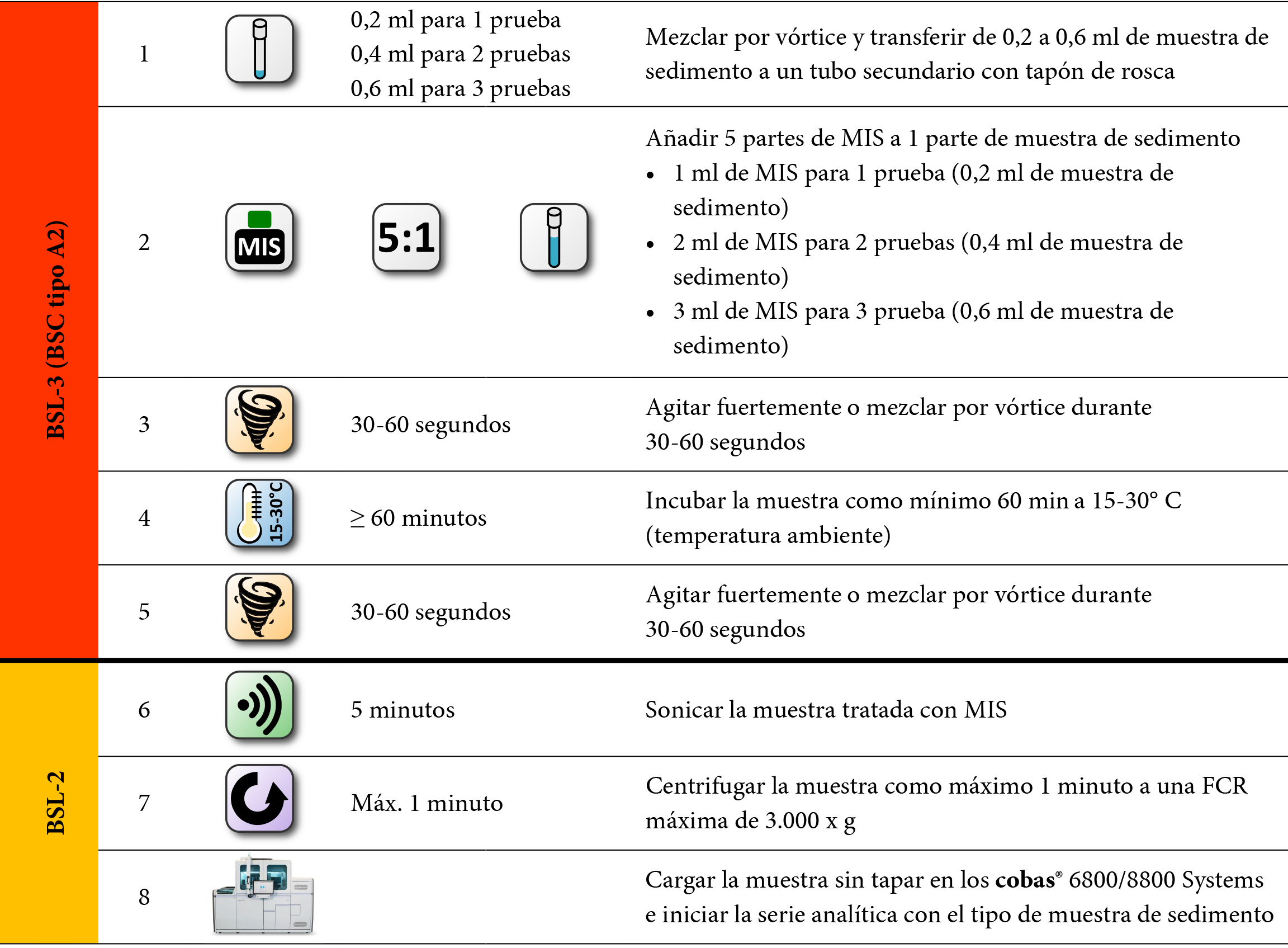Ahora, las muestras tratadas con MIS y sonicadas pueden ejecutarse con la prueba COBAS® MTB o bien almacenarse en las condiciones especificadas en el apartado “Almacenamiento de muestras inactivadas”.