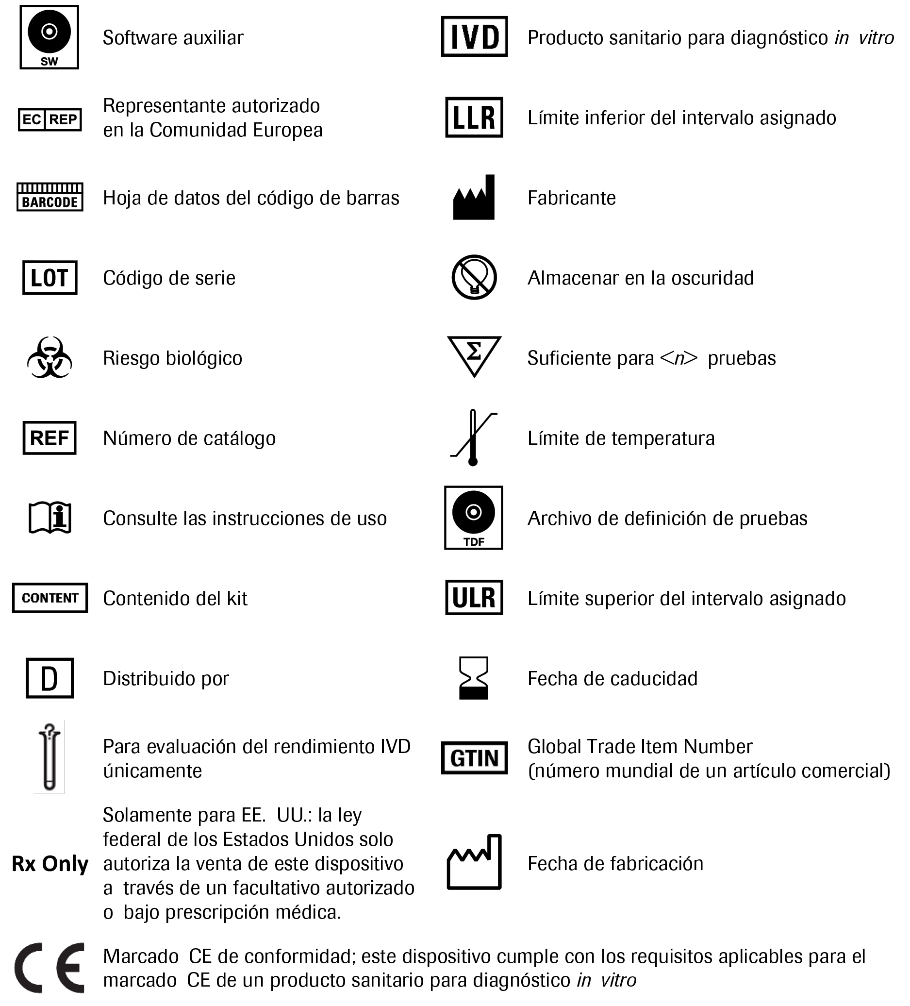 Los símbolos siguientes se emplean en el rotulado de todos los productos de diagnóstico por PCR de Roche.