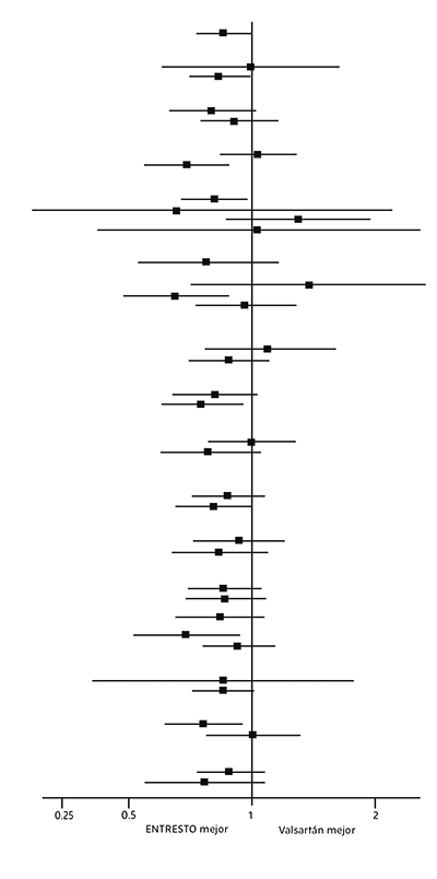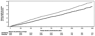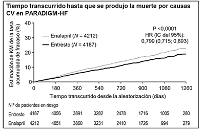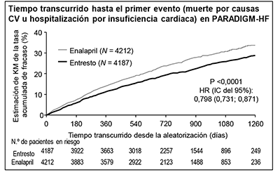 ENTRESTO® demostró una superioridad clínica y estadísticamente significativa respecto a enalapril, ya que, comparado con este, redujo el riesgo de muerte por causas CV o de hospitalizaciones por IC en un 20% (cociente de riesgos instantáneos [hazard ratio; HR]: 0.80; IC del 95% [0.73; 0.87], p = 0.0000002 en la prueba unilateral). Este efecto se observó pronto y se mantuvo durante todo el ensayo. La reducción del riesgo absoluto fue del 4.69%. Se observó una reducción estadísticamente significativa de las muertes por causas CV y de las primeras hospitalizaciones por IC (muerte por causas CV, reducción del riesgo relativo [RRR]: 20%, HR: 0.80; IC del 95% [0.71; 0.89], p = 0.00004 en la prueba unilateral, y hospitalización por IC, RRR: 21%; HR: 0,79; IC del 95% [0.71; 0.89], p = 0.00004 en la prueba unilateral); véanse la Tabla 1 y la Figura 1. La muerte súbita representó el 45% de las muertes por causas CV y se redujo un 20% en los pacientes tratados con ENTRESTO® en comparación con los que recibieron enalapril (HR: 0.80, p = 0.0082). El fallo de la bomba representó el 26% de las muertes por causas CV y se redujo un 21% en los pacientes tratados con ENTRESTO® en comparación con los que recibieron enalapril (HR: 0.79, p = 0.0338).