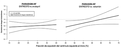 Paragon-hf: PARAGON-HF fue un ensayo multicéntrico, aleatorizado, doble ciego que comparó ENTRESTO® y valsartán en 4,796 pacientes adultos con insuficiencia cardiaca sintomática con fracción de eyección preservada (fracción de eyección del ventrículo izquierdo ≥45%) y cardiopatía estructural [agrandamiento de la aurícula izquierda (LAE) o hipertrofia ventricular izquierda (HVI)]. Se excluyeron los pacientes con una presión arterial sistólica de <110 mmHg y los pacientes con cualquier FEVI ecocardiográfica previa <40% en el momento del cribado.