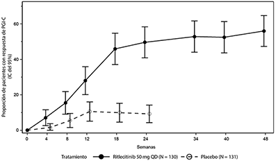 Se observó una mejora significativa en la Impresión Global de Cambio del Paciente (PGI-C por sus siglas en inglés) para ritlecitinib 50 mg en comparación con el placebo en la semana 24, con tasas de respuesta que continuaron incrementando hasta la semana 48 (Tabla 1 y Figura 3).