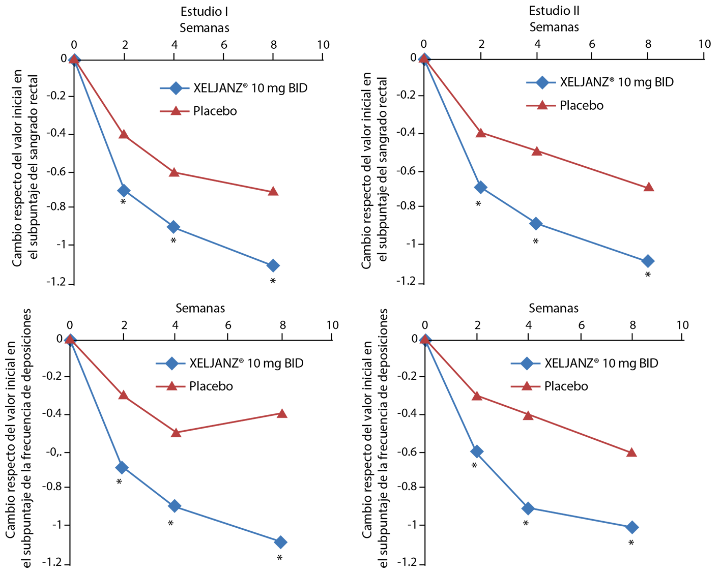 Los pacientes en los estudios fase 3 tuvieron un índice de actividad de la enfermedad medio (DAS28-4[ESR]) de 6.1–6.7 en el inicio. Las reducciones significativas en DAS28-4 (ESR) a partir del inicio (mejoría media) de 1.8-2.0 y 1.9-2.2 se observaron en pacientes tratados con 5 y 10 mg de XELJANZ®, respectivamente, en comparación con los pacientes tratados con placebo (0.7-1.1) < 2.6) en los estudios II, III y IV fue significativamente mayor en los pacientes que recibieron 5 mg o 10 mg de XELJANZ® (6-9% y 13-16%, respectivamente) en comparación al 1-3% de los pacientes con placebo a los 6 meses. En el estudio III, los porcentajes de pacientes que alcanzaron DAS28-4(ESR) < 2.6 que se observaron con XELJANZ® 5 mg dos veces al día, 10 mg dos veces al día y adalimumab a los 6 meses fueron 6.2%, 12.5% y 6.7% respectivamente.