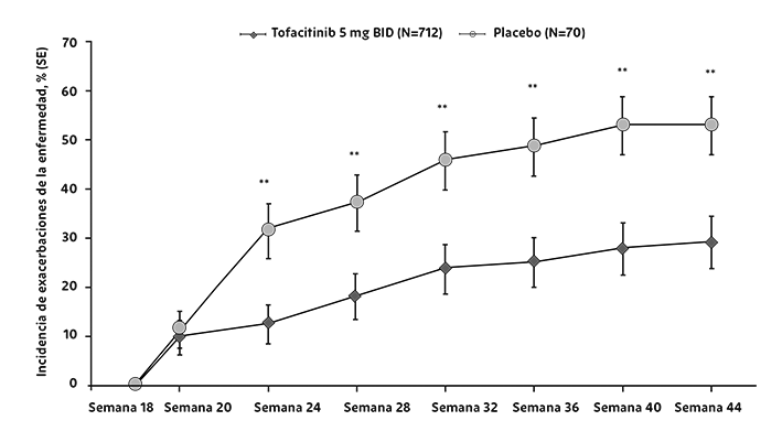 Las IR (IC del 95%) para el herpes zóster (incluye todos los eventos de herpes zóster) para XELJANZ® 5 mg dos veces al día, XELJANZ® 10 mg dos veces al día, todos los grupos de XELJANZ® (combina los grupos de tratamiento de 5 mg dos veces al día y 10 mg dos veces al día) y los inhibidores del TNF fueron de 3.75 (3.22, 4.34), 3.94 (3.38, 4.57), 3.84 (3.45, 4.26) y 1.18 (0.90, 1.52) pacientes con eventos por cada 100 PY, respectivamente. En comparación con el inhibidor del TNF, la HR (IC del 95%) para el herpes zóster con XELJANZ® 5 mg dos veces al día, XELJANZ® 10 mg dos veces al día y todos los grupos de XELJANZ® fueron 3.17 (2.36, 4.27), 3.33 (2.48, 4.48) y 3.25 (2.46, 4.29), respectivamente.