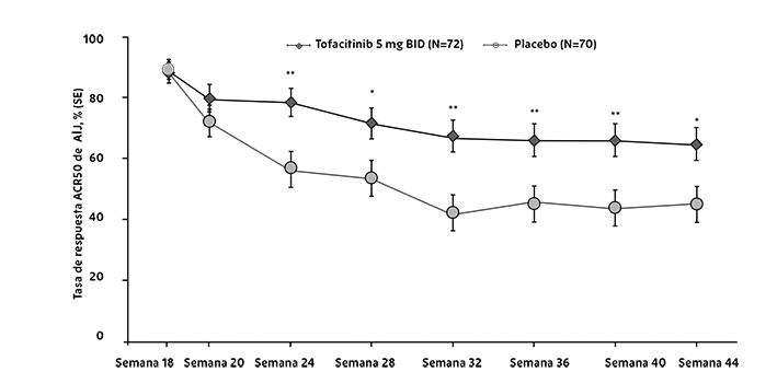 Respuesta ACR: Los porcentajes de pacientes tratados con XELJANZ® que alcanzaron respuestas ACR20, ACR50 y ACR70 en los estudios I, II, IV, V y VI se muestran en la tabla 1. En todos los estudios, los pacientes tratados con 5 o 10 mg dos veces al día presentaron tasas de respuestas ACR20, ACR50 y ACR70 estadísticamente significativas a los 3 y 6 meses en comparación con los pacientes tratados con placebo (o en comparación con MTX en el estudio VI).