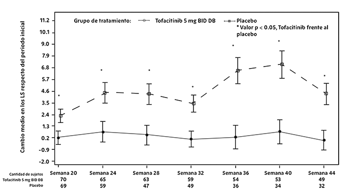 En la visita de los 3 meses, todos los pacientes del grupo placebo se cambiaron de forma ciega a un segundo tratamiento predeterminado de XELJANZ® 5 o 10 mg dos veces al día. Los criterios de valoración primarios a los 3 meses fueron la proporción de pacientes que alcanzaron una respuesta ACR20, los cambios en el Cuestionario de Evaluación de Salud e Índice de Discapacidad (HAQ-DI, por sus siglas en inglés) y las tasas de índice de actividad de la enfermedad calculado con Velocidad de Sedimentación Globular (DAS28-4 [ESR, por sus siglas en inglés]) < 2.6.