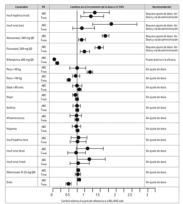 NOTA: Los grupos de referencia de los datos de insuficiencia renal y hepática corresponden a sujetos con funciones renales o hepáticas normales, respectivamente; el grupo de referencia de la interacción medicamentosa y de los estudios de efecto de los alimentos corresponde a la administración de Xeljanz® solo; Mod. = moderado; Sev. = severo; Insuf. = Insuficiencia.