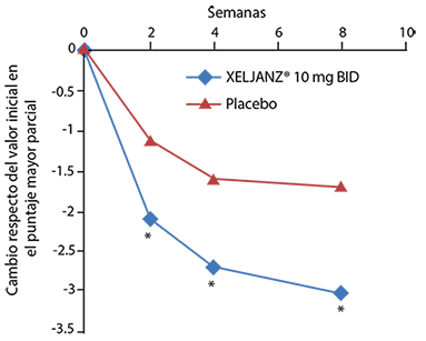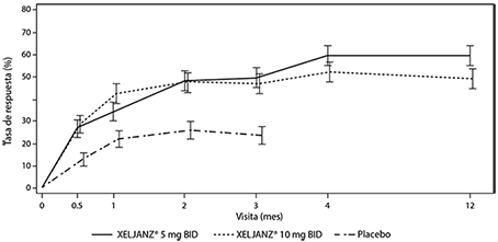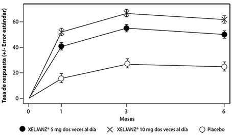 Respuesta de ACR: En la Tabla 1, se muestran los porcentajes de pacientes tratados con Xeljanz® que lograron respuestas ACR20, ACR50 y ACR70 en los Estudios I, II, IV, V y VI. En todos los estudios, los pacientes tratados con 5 o 10 mg de Xeljanz® dos veces al día tuvieron tasas de respuestas ACR20, ACR50 y ACR70 estadísticamente significativas en el mes 3 y en el mes 6 en comparación con los pacientes tratados con placebo (o en comparación con los tratados con MTX en el Estudio VI).
