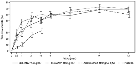 Durante las fases controladas de 3 meses (Estudios I y V) y de 6 meses (Estudios II, III y IV) de los estudios, los pacientes tratados con Xeljanz® con dosis de 10 mg dos veces al día, por lo general, presentaron tasas de respuesta mayores que los pacientes tratados con Xeljanz® 5 mg dos veces al día. En el Estudio III, los criterios primarios de valoración fueron la proporción que logró una respuesta ACR20 en el mes 6, un cambio en el HAQ-DI en el mes 3 y un DAS28-4(ESR) < 2.6 en el mes 6. Los datos de estos resultados primarios fueron 51.5%, 52.6%, 47.2% y 28.3%; -0.55%, -0.61%, -0.49% y -0.24%; y 6.2%, 12.5%, 6.7% y 1.1% para la dosis de Xeljanz® 5 mg dos veces al día, Xeljanz® 10 mg dos veces al día, adalimumab de 40 mg por vía subcutánea cada dos semanas y los grupos tratados con placebo, respectivamente. En el caso de un criterio secundario de valoración especificado previamente, las tasas de respuesta ACR70 en el mes 6 para los grupos de Xeljanz® 5 mg administrado dos veces al día y de 10 mg administrado dos veces al día fueron considerablemente mayores que las de adalimumab (19.9%, 21.9% y 9.1%, respectivamente).