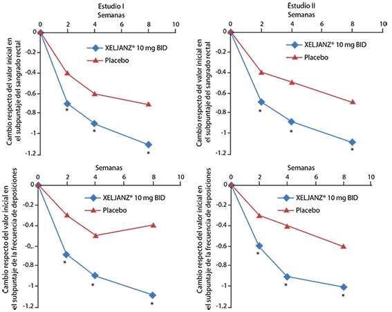 Respuesta DAS28-4 (ESR): Los pacientes de los estudios en Fase 3 tuvieron un Puntaje de actividad de la enfermedad (DAS28-4[ESR]) medio de 6.1 a 6.7 en el periodo inicial. Se observaron reducciones importantes en el DAS28-4(ESR) desde el periodo inicial (mejoría media) de 1.8 a 2.0 y de 1.9 a 2.2 en los pacientes tratados con Xeljanz® 5 y 10 mg, respectivamente, en comparación con los pacientes tratados con placebo (0.7 a 1.1) a los 3 meses. En el mes 6, la proporción de pacientes que logró una remisión clínica de DAS28 (DAS28-4(ESR) < 2.6) en los Estudios II, III y IV fue significativamente mayor en los pacientes que recibieron Xeljanz® 5 o 10 mg (del 6 al 9% y del 13 al 16%, respectivamente) en comparación con los pacientes tratados con placebo entre los cuales de un 1 a un 3% lograron una remisión clínica. En el Estudio III, los porcentajes observados de pacientes que lograron DAS28-4(ESR) < 2.6 para Xeljanz® 5 mg dos veces al día, Xeljanz® 10 mg dos veces al día y adalimumab en el mes 6 fueron 6.2%, 12.5% y 6.7%, respectivamente.