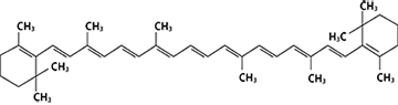 Beta-caroteno (vitamina A): Pigmento orgánico, de color rojo anaranjado intenso, abundante en plantas y frutas. Entre los carotenos, el β-caroteno se distingue por tener anillos beta en ambos extremos de la molécula. En la naturaleza, el β-caroteno es un precursor (forma inactiva) de la vitamina A, una vitamina liposoluble. Peso molecular: 536,8726 g/mol.