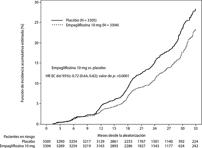 JARDIANZ® fue superior al placebo en la reducción del riesgo del criterio de valoración principal compuesto de una reducción de la TFGe sostenida ≥ 40%, TFGe sostenida < 10 mL/min/1.73 m2, progresión a enfermedad renal terminal o muerte por causas CV o renales. El efecto del tratamiento reflejó una reducción en una reducción de la TFGe sostenida ≥ 40%, TFGe sostenida < 10 mL/min/1.73 m2, progresión a enfermedad renal terminal y muerte por causas CV. Hubo pocas muertes por causas renales durante el ensayo. JARDIANZ® también redujo el riesgo de la primera hospitalización y la hospitalización recurrente (consulte la tabla 18 y la figura 13); la información recopilada sobre el motivo para la hospitalización no fue suficiente para caracterizar mejor el beneficio.