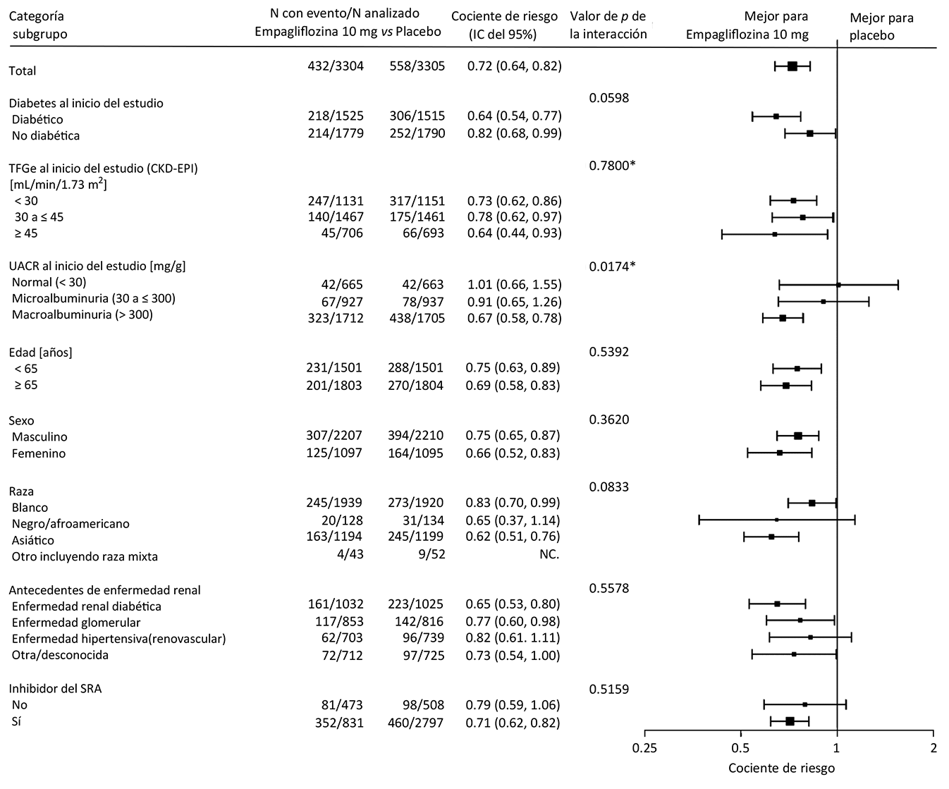 Los resultados del criterio de valoración compuesto principal generalmente fueron constantes entre los subgrupos preespecificados examinados, incluidas las categorías de la TFGe, la causa subyacente de la enfermedad renal, el estado de la diabetes o el uso base de los inhibidores del SRA (consulte la figura 14). El beneficio del tratamiento con JARDIANZ® en el criterio de valoración compuesto principal no fue evidente en pacientes con niveles muy bajos de albuminuria; sin embargo, hubo pocos eventos en estos pacientes.