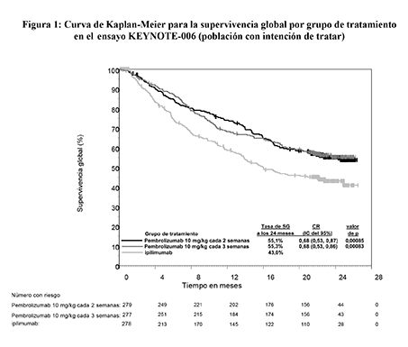 La seguridad y eficacia de pembrolizumab se investigó en el ensayo KEYNOTE-006, un ensayo de Fase III, multicéntrico, controlado, para el tratamiento del melanoma avanzado en pacientes sin tratamiento previo con ipilimumab. Los pacientes fueron aleatorizados (1:1:1) a recibir pembrolizumab 10 mg/kg cada 2 (n=279) o 3 semanas (n=277) o ipilimumab 3 mg/kg cada 3 semanas (n=278). No se requirió que los pacientes con melanoma con mutación de BRAF V600E hubieran recibido tratamiento previo con un inhibidor de BRAF.