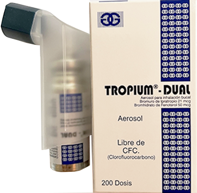TROPIUM® DUAL AEROSOL BUCAL contiene dos ingredientes activos con efecto broncodilatador, el bromuro de ipratropio que presenta un efecto anticolinérgico y el bromhidrato de fenoterol un agente β-adrenérgico.