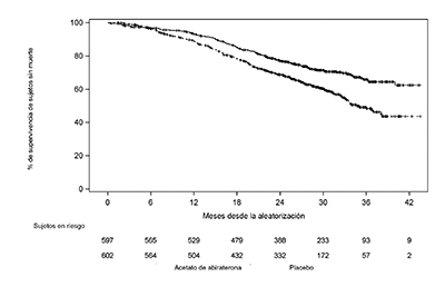 En un análisis planeado, realizado después de observarse 552 muertes, el 42% (333 de 797) de los pacientes tratados con ZYTIGA®, en comparación con el 55 % (219 de 398) de los pacientes tratados con el placebo, habían muerto. En los pacientes tratados con ZYTIGA® se observó una mejoría estadísticamente significativa en la mediana de la supervivencia global (ver tabla 7 y la figura 8). Se realizó un análisis actualizado de la supervivencia cuando se observaron 775 muertes (97% del número de muertes planeadas para el análisis final). Los resultados a partir de este análisis actualizado de la supervivencia fueron consistentes con los del análisis primario de la supervivencia (ver la tabla 4).